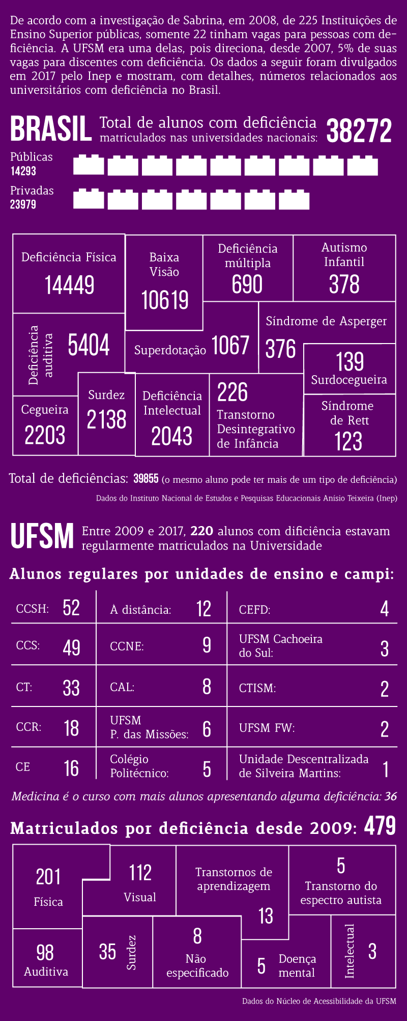 A entrada de alunos com deficiência nas universidades brasileiras aumentou progressivamente desde a aprovação da Lei n°12.711, em agosto de 2012, pelo Supremo Tribunal Federal (STF), quando foi adotada a política de cotas. Entretanto, o Ensino Superior está realmente preparado para receber pessoas, para as quais, antes, o acesso era bastante limitado? Esse foi um dos pontos principais da tese da professora do Departamento de Educação Especial da UFSM Sabrina Fernandes de Castro. Sua pesquisa tinha como finalidade identificar as ações e iniciativas de universidades públicas relacionadas ao ingresso e à permanência de estudantes com deficiência, abordando impedimentos e facilitadores da continuidade desses acadêmicos nas instituições de ensino.