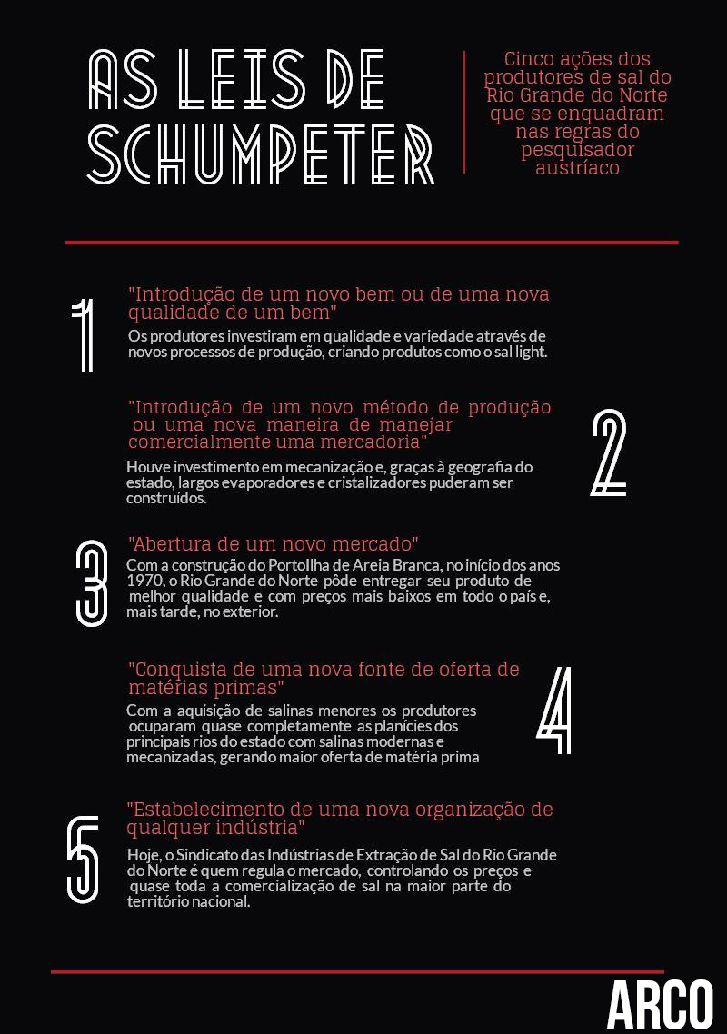 A resposta para o sucesso do Rio Grande do Norte pode estar na teoria de um economista austríaco da primeira metade do século 20, Joseph Schumpeter. A proposta é resultado de um trabalho conjunto de pesquisadores de três dos quatros estados produtores: Marco Túlio Mendonça Diniz (UFRN), Fábio Perdigão Vasconcellos (UECE) e Márcia Barbosa Martins (UERJ) consideram que o desenvolvimento das salinas no Rio Grande do Norte acabou por utilizar a metodologia empreendedora de Schumpeter.