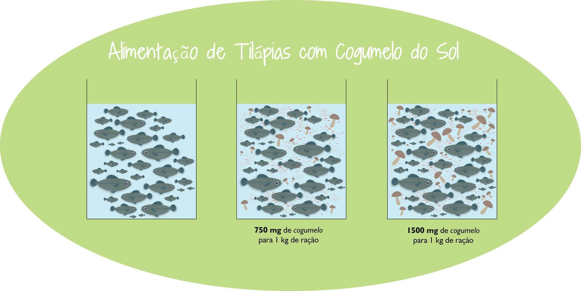 A pesquisa utilizou 240 peixes pré-adultos que foram alimentados duas vezes por dia durante 10 dias. As tilápias foram distribuídas em três tratamentos, variando a quantidade de cogumelo do sol adicionado em uma ração comercial com 28% de proteína bruta: o primeiro grupo serviu de controle, portanto não foi alimentado com o cogumelo; na dieta do segundo grupo foi adicionado 750 mg por quilo de ração; o terceiro grupo recebeu 1500 mg por quilo de ração.
