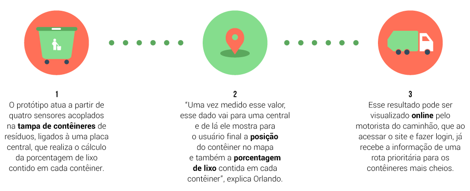 O protótipo atua a partir de quatro sensores acoplados na tampa de contêineres de resíduos, ligados à uma placa central, que realiza o cálculo da porcentagem de lixo contido em cada contêiner. “Uma vez medido esse valor, esse dado vai para uma central e de lá ele mostra para o usuário final a posição do contêiner no mapa e também a porcentagem de lixo contida em cada contêiner”, explica Orlando. Esse resultado pode ser visualizado online pelo motorista do caminhão, que ao acessar o site e fazer login, já recebe a informação de uma rota prioritária para os contêineres mais cheios.