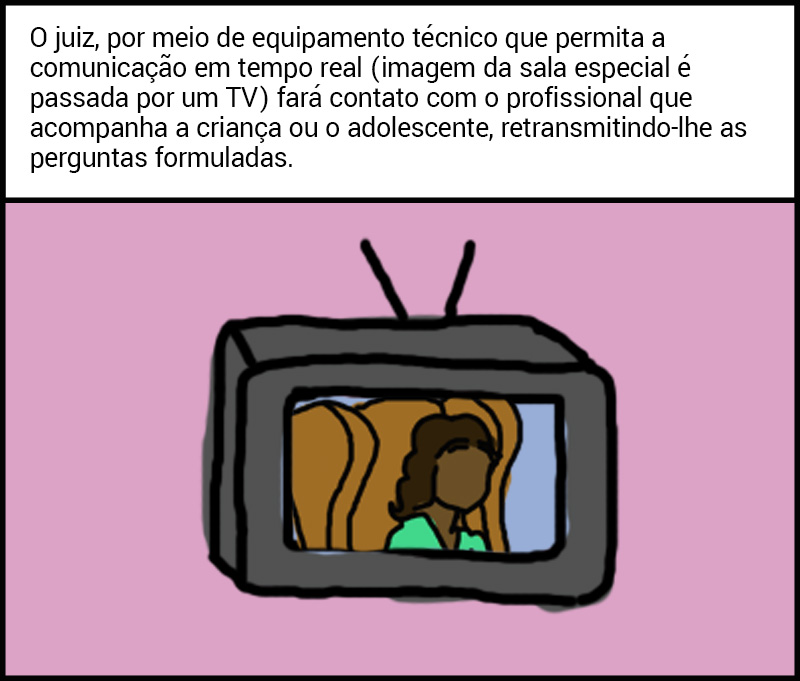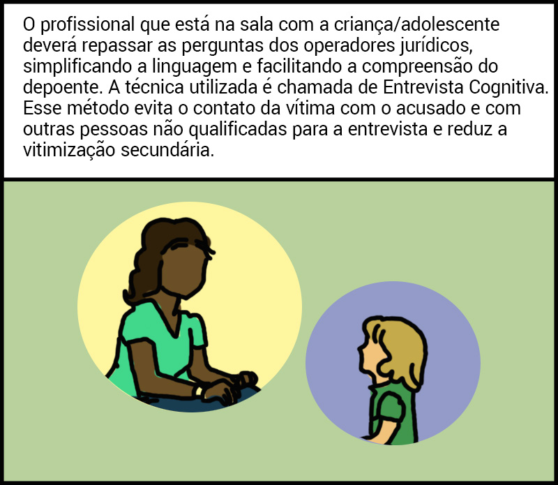 O momento da escuta do depoimento em um ambiente reservado, no entanto, permite que crianças e adolescentes sejam poupados do constrangimento e tenham amplo acesso aos seus direitos. Conforme prevê a Convenção Internacional dos Direitos da Criança, é um direito dela falar em juízo se tiver interesse, com suas próprias palavras, em qualquer processo que lhe diga respeito. Para que a ação seja efetuada sem causar danos à moral do depoente, Luciane aponta que a “capacidade do profissional jurista para ouvir os relatos não é suficiente e nem eficiente” e, portanto, deve haver o envolvimento de profissionais do ramo da psicologia, assistência social ou pedagogia.
