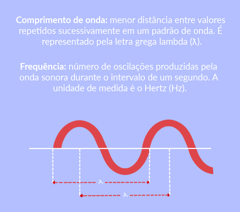 O ouvido humano consegue escutar sons entre a frequência mínima de 20 Hz – grave, com comprimento de onda de 17 metros – e a frequência máxima de 20000 Hz – aguda, com comprimento de onda de 17 milímetros.