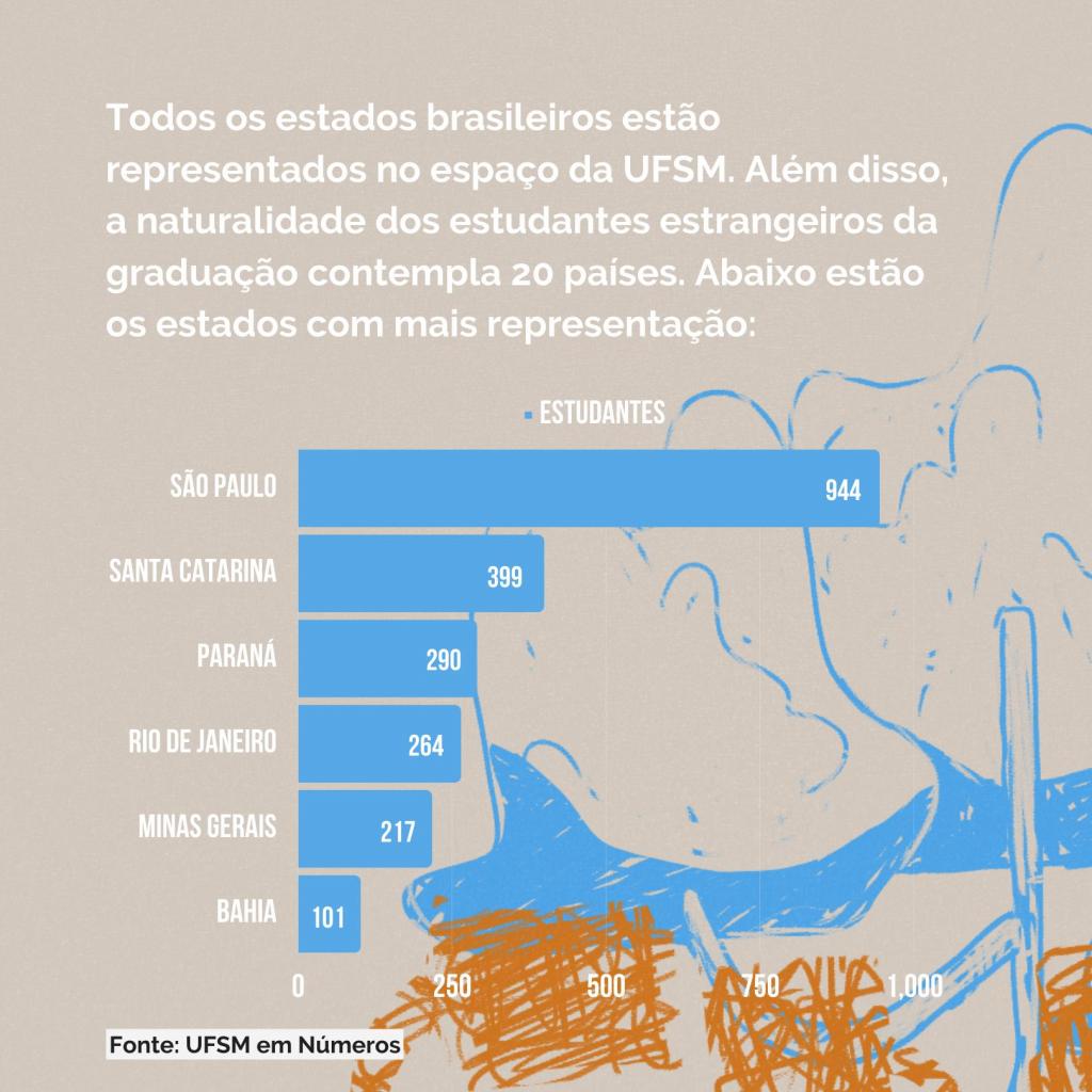 A UFSM é uma universidade, que, só na graduação, tem cerca de 20.900 estudantes. Destes, 16.870 são de diferentes regiões do Rio Grande do Sul. São, portanto, mais de 4 mil alunos que saem de suas regiões e estados de origem para estudar em Santa Maria. De acordo com o portal ‘UFSM em Números’, depois do Rio Grande do Sul, São Paulo é o estado que mais tem representação (944 estudantes). Depois, vêm os estados de Santa Catarina (399), Paraná (290), Rio de Janeiro (264), Minas Gerais (217) e Bahia (101). Todos os estados brasileiros estão representados no espaço da UFSM. Além disso, a nacionalidade dos estudantes estrangeiros da graduação contempla 20 países.