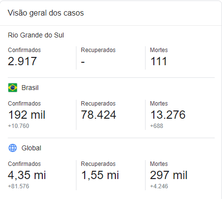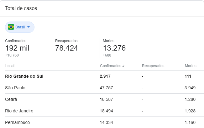 O Rio Grande do Sul é o 13º Estado com mais números de afetados pelo COVID-19, sendo que não foram divulgados os números de testes. Segundo G1 Bem Estar, 74,10% dos leitos de UTI em todo o estado estão ocupados em 13/5.