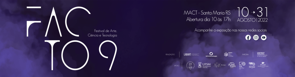 Esta exposição apresenta artistas pesquisadores, docentes e discentes, que integram o Grupo de Pesquisa Arte e Tecnologia/CNPq e o Laboratório de Pesquisa Arte Contemporânea, Tecnologia e Mídias Digitais/LABART, como também convidados nacionais e internacionais. A mostra no Museu Arte Ciência Tecnologia é tanto um marco temporal de atividades desenvolvidas na graduação e pós-graduação em Artes Visuais, em quase duas decadas, quanto a consolidação do projeto MACT como espaço universitário de exibição da produção contemporânea junto ao Mezanino do Planetário/UFSM.
