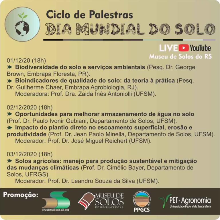 O Ciclo de Palestras em comemoração ao dia mundial do solo em 2020 foi uma promoção do Departamento de Solos, Museu de Solos do RS, Programa de Pós-graduação em Ciência do Solo e do PET Agronomia da UFSM. O evento foi realizado de forma remota, com transmissão direta no canal YouTube do Museu de Solos do RS, nos dias 01, 02 e 03 de dezembro de 2020. Ao longo do evento foram realizadas 5 palestras sobre temas importantes à ciência do solo, conforme programação abaixo.