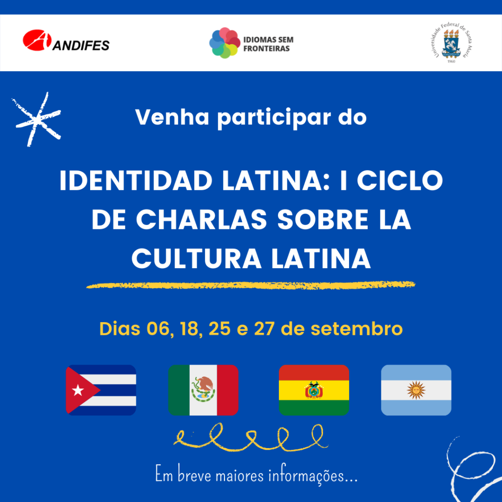 Nos dias 06, 18, 25 e 27 de setembro, o IsF Espanhol UFSM – Rede Andifes promove o Identidad Latina: I Ciclo de charlas de la cultura Latinaevento online e gratuito em que os palestrantes são convidados a falar dos seus países, os quais têm a língua espanhola como oficial. O evento será realizado em espanhol e através do Google Meet, portanto tem vagas limitadas de inscritos. As inscrições estarão abertas para cada uma das palestras através dos formulários que serão dispostos semana a semana: