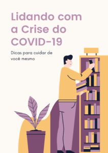 DESCRIÇÃO DE IMAGEM: imagem retangular vertical, com fundo na cor rosada. No topo da imagem, alinhado à esquerda, em letras na cor lilás, lê-se “Lidando com a crise do COVID-19”. Abaixo, em letras na cor preta, lê-se “Dicas para cuidar de você mesmo”. À esquerda, há a imagem de um homem, de estatura alta, com a pele branca e cabelos pretos, vestindo blusa de manga longa de cor alaranjada, calças na cor lilás e sapatos pretos. À frente do homem, há uma estante repleta de livros, alternados nas cores laranja, lilás e preto. O homem apoia cinco livros no braço direito e com a mão esquerda, retira mais um libro da estante. A estante, externamente, é de cor laranja e internamente, na cor lilás. Atrás do homem, no assoalho, há um vaso de planta, na cor lilás. Na parede atrás ao lado do direito do homem, há um efeito artíostico, na forma de montanha, nas cores laranja e lilás.