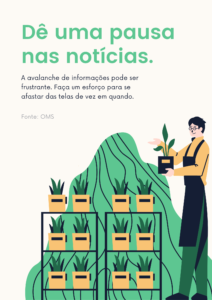 DESCRIÇÃO DE IMAGEM: imagem retangular vertical, com fundo na cor rosada. No topo da imagem, centralizado, lê-se “Dê uma pausa nas notícias”. Abaixo, lê-se “A avalanche de informações pode ser frustrante. Faça um esforço para se afastar das telas de vez em quando”. Abaixo, lê-se “Fonte: OMS”. Abaixo, há a imagem de um homem, de perfil, e de uma estante com vasos de plantas, a sua frente. O homem tem estatura alta, usa óculos, tem bigodes, pele branca e cabelos pretos. Veste calça na cor verde escura, camisa de manga longa alaranjada, sapatos e avental preto. Na mão esquerda, ele segura um vaso de plantas, na cor preta, com folhagem na cor verde escura. O braço direito está flexionado e com a mão ele indica a estante das plantas. Os vasos de plantas têm cor frontal alaranjada, com folhagens verde escura, estando dispostos de dois a dois em cada prateleira da estante. Na parede atrás da estante, há um efeito artístico, na forma de montanha, cor verde clara, com traços sinuosos na cor preta, distribuídos no sentido diagonal.