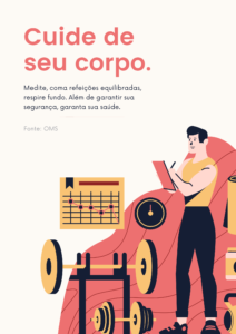 DESCRIÇÃO DE IMAGEM: imagem retangular vertical, com fundo na cor rosada. No topo da imagem, à esquerda, lê-se “Cuide de seu corpo”. Abaixo, em letras na cor preta, lê-se “Medite, coma refeições equilibradas, respire fundo. Além de garantir sua segurança, garanta sua saúde”. Abaixo, lê-se “Fonte: OMS”. Ao lado direito, há a imagem de um homem, estatura alta, usa óculos, tem bigodes, pele branca, cabelos pretos e aspecto musculoso. Veste calça e sapatos pretos e regata alaranjada. Ele está em pé, de perfil, fazendo anotações numa prancheta. À frente e atrás do homem, há aparelhos de musculação. Na parede ao fundo, há um relógio, uma planilha de medição de circuitos de corrida e um efeito artístico em formato de montanha, este na cor vermelha, em tom fosco.