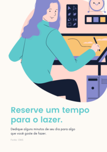 DESCRIÇÃO DE IMAGEM: imagem retangular vertical, com fundo na cor rosa clara. No topo da imagem, há a figura de uma jovem mulher de pele branca, cabelo azul, comprimento médio, ondulado. Ela veste blusa esverdeada de manga longa e calça preta. A mulher está sentada de costas, olhando para trás. Ela está sentada em frente a uma bancada inclinada, onde rabisca em uma tela de desenho. Embaixo da bancada, há a CPU de um computador. Na parede à frente da bancada, há uma régua com modelos geométricos e uma aquarela de tintas. Todas as imagens situam-se dentro de um círculo na cor rosa, tom mediano. Abaixo da imagem, ao lado esquerdo, lê-se “Reserve um tempo para o lazer. Dedique alguns minutos de seu dia para algo que você goste de fazer”. Abaixo, lê-se “Fonte: OMS”.