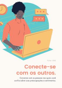 DESCRIÇÃO DE IMAGEM: imagem retangular vertical, com fundo na cor rosa clara. A imagem mostra uma mulher de pele negra, alta, de cabelo curto e encaracolado. A mulher veste blusa de manga longa e gola alta, na cor rosa, tom fosco. A mulher está de frente para uma bancada, na cor azul, digitando em um notebook. A mulher usa headphones e está sorrindo. Atrás da mulher, há uma parede na cor azul celeste, onde há um relógio e duas pequenas prateleiras. A imagem está dentro de um círculo, na cor azul. Abaixo da imagem, à direita, lê-se “Conecte-se com os outros”, na cor rosa, tom fosco. Abaixo, em letras pretas, lê-se “Converse com as pessoas nas quais você confia sobre suas preocupações e sentimentos”.