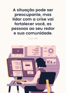 DESCRIÇÃO DE IMAGEM: imagem retangular vertical, com fundo na cor rosa clara. No topo da imagem, centralizado, lê-se: “A situação pode ser preocupante, mas lidar com a crise vai fortalecer você, as pessoas a seu redor e a sua comunidade”. Abaixo, lê-se “Fonte: OMS”. Abaixo, há a figura de uma mulher, de pele clara, cabelos pretos, com corte estilo chanel, com franja. Ela veste calça preta e blusa sem mangas, com gola alta, na cor lilás. Ela está sentada de costas, digitando em um computador de mesa. A sua frente, na parede, há imagens de planilhas e gráficos. A cor predominante na imagem é a lilás.