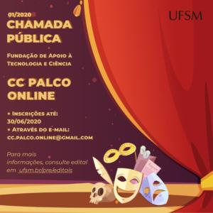 A Universidade Federal de Santa Maria (UFSM)/Coordenadoria de Ações Educacionais(CAEd) soma-se à divulgação de chamada pública destinada a artistas de Santa Maria-RS. Maiores informações no link a seguir, sendo que a imagem contida na reportagem está descrita abaixo: https://www.ufsm.br/outros-orgaos/cc/2020/06/16/projeto-palco-online/