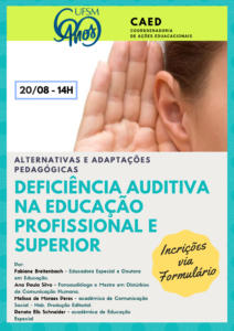 A Universidade Federal de Santa Maria(UFSM)/Coordenadoria de Ações Educacionais(CAEd) convida para o evento “Deficiência Auditiva na Educação Profissional e Superior”, dia 20 de agosto de 2020, às 14h00min.