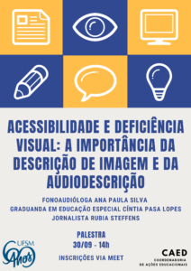 A Universidade Federal de Santa Maria(UFSM)Coordenadoria de Ações Educacionais(CAEd) convida para a palestra Acessibilidade e Deficiência Visual: a importância da descrição de imagem e da audiodescrição, dia 30 de setembro, às 14h00min.