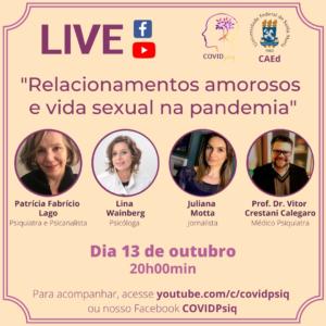 A Universidade Federal de Santa Maria(UFSM)/Coordenadoria de Ações Educacionais(CAEd) e o projeto COVID Psiq convidam todos para assistirem à live com a temática “Relacionamentos amorosos e vida sexual na pandemia”, pela médica psicanalista Patrícia Fabrício Lago, pela psicóloga Lina Wainberg, pela jornalista Juliana Motta e pelo Prof. Dr. Vitor Crestani Calegaro, dia 13 de outubro, às 20h00min.