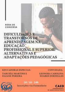A Universidade Federal de Santa Maria(UFSM)/Coordenadoria de Ações Educacionais(CAEd) convida para a roda-de-conversa intitulada Dificuldades e Transtornos de Aprendizagem na Educação Profissional e Superior: Alternativas e Adaptações Pedagógicas, a ser realizada dia 28 de outubro de 2020, às 14h20min.