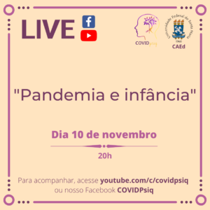 A Coordenadoria de Ações Educacionais (CAEd) e o Projeto COVID Psiq convidam todos para assistirem à live intitulada “Pandemia e infância”, no dia 10 de novembro de 2020, às 20h00min.