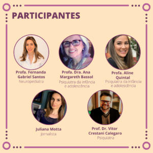 Descrição de imagem 02: imagem em formato quadrado, com o fundo da imagem na cor bege, com bordas formadas por linhas retas, sendo que nos quatro ângulos há pequenos círculos, ladeados por três pontos, tanto no sentido horizontal quanto vertical, todos na cor roxa. No ângulo superior esquerdo, lê-se “PARTICIPANTES”. Abaixo, dentro de círculos na cor roxa, há as fotos dos participantes da live, sendo três fotos na primeira linha e duas na segunda. A distribuição das fotos está no sentido da esquerda para a direita. A primeira foto é da Profa. Fernanda Gabriel Santos, neuropediatra, tratando-se de mulher de pele clara, cabelos loiros na altura dos ombros, expressão sorridente, vestindo jaleco branco, usando brincos e corrente. Na sequência, há a foto da Profa. Dra. Margareth Bassol, psiquiatra da infância e adolescência, tratando-se de mulher de pele clara, cabelos loiros na altura do pescoço, e expressão sorridente. Usa óculos de grau e multicolar de pérolas. Em seguida, há a foto da Profa. Aline Quintal, psiquiatra da infância e adolescência, tratando-se de mulher de pele clara, cabelos longos e castanhos, expressão sorridente, com foto de semi-perfil, vestindo blusa preta de gola alta. Abaixo, á esquerda, há a foto de Juliana Motta, jornalista, tratando-se mulher de pele clara, cabelos loiros e lisos até os ombros, com um leve sorriso e vestindo blusa lilás. À direita, há a foto do Prof. Dr. Vitor Crestani Calegaro, psiquiatra, tratando de homem de pele clara, cabelos curtos e castanhos e expressão sorridente. Usa óculos de grau e barba. Veste camisa social bege, blusa pull over, nas cores marrom e preta, e casaco preto. A identificação dos participantes, em letras na cor roxa, encontra-se abaixo das fotos.