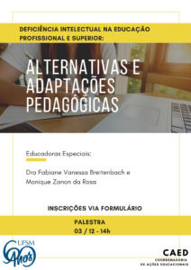 A Universidade Federal de Santa Maria/Coordenadoria de Ações Educacionais(CAEd) convida para a palestra “Deficiência intelectual na educação profissional superior: Alternativas e adaptações pedagógicas”, dia 03 de dezembro de 2020, às 14h00min.