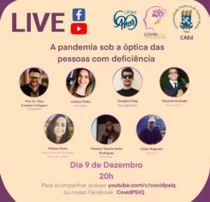 “A pandemia trouxe consigo consequências que são encaradas de múltiplas formas por indivíduos diferentes e com realidades distintas. Como forma de tentar compreender um pouco a realidade do próximo, traremos esta semana a live com o tema “A pandemia sob a óptica das pessoas com deficiência”, apresentada pelo engenheiro agrônomo Douglas Utzig, pelo clínico geral Eduardo Andrade, pela graduanda em Produção Editorial Melissa Peres, pela psicóloga Mariane Teixeira Netto Rodrigues, pelo músico Cezar Nogueira, pelo médico psiquiatra Vitor Crestani Calegaro e pela jornalista Juliana Motta. A live será transmitida pelo Facebook e pelo YouTube, dia 9 de dezembro de 2020, às 20h.