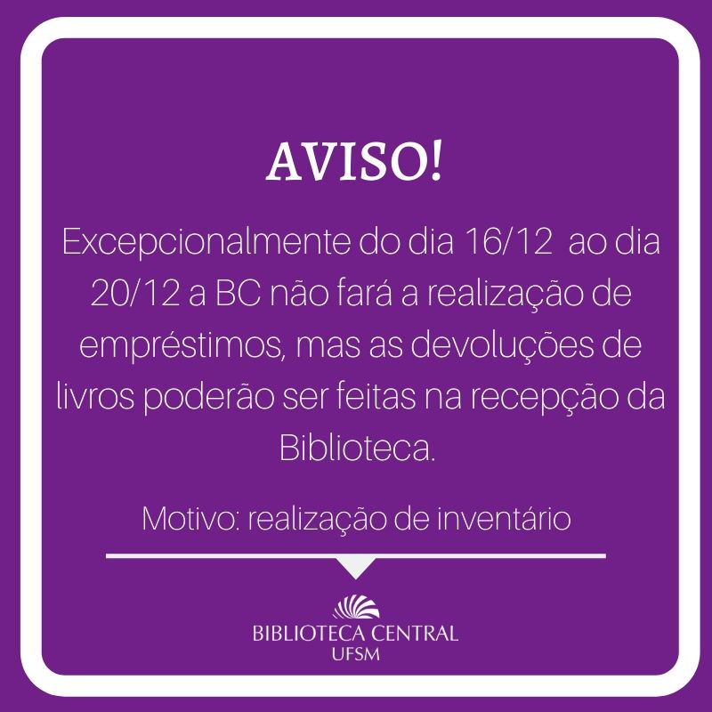 Durante a semana do inventário serão aceitas somente devoluções de livros. Porém as renovações seguem ininterruptas via sistema ou pelo aplicativo. Também comunicamos que as bibliotecas da UFSM estão com o calendário programado para o empréstimo de férias (longa duração) com o objetivo de incentivar a leitura no período de recesso e de férias letivas. Livros retirados ou renovados após 13/12 serão entregues somente em março.