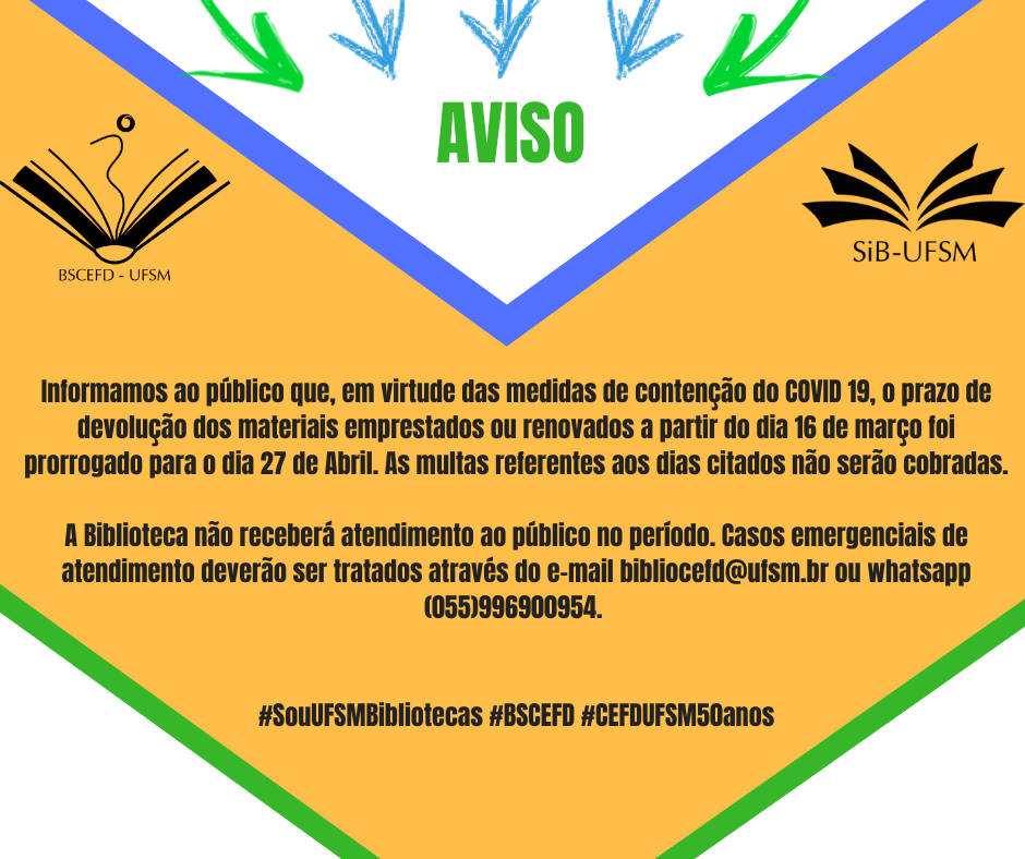 A Biblioteca não receberá atendimento ao público no período. Casos emergenciais de atendimento deverão ser tratados através do e-mail bibliocefd@ufsm.br ou whatsapp (055)996900954.