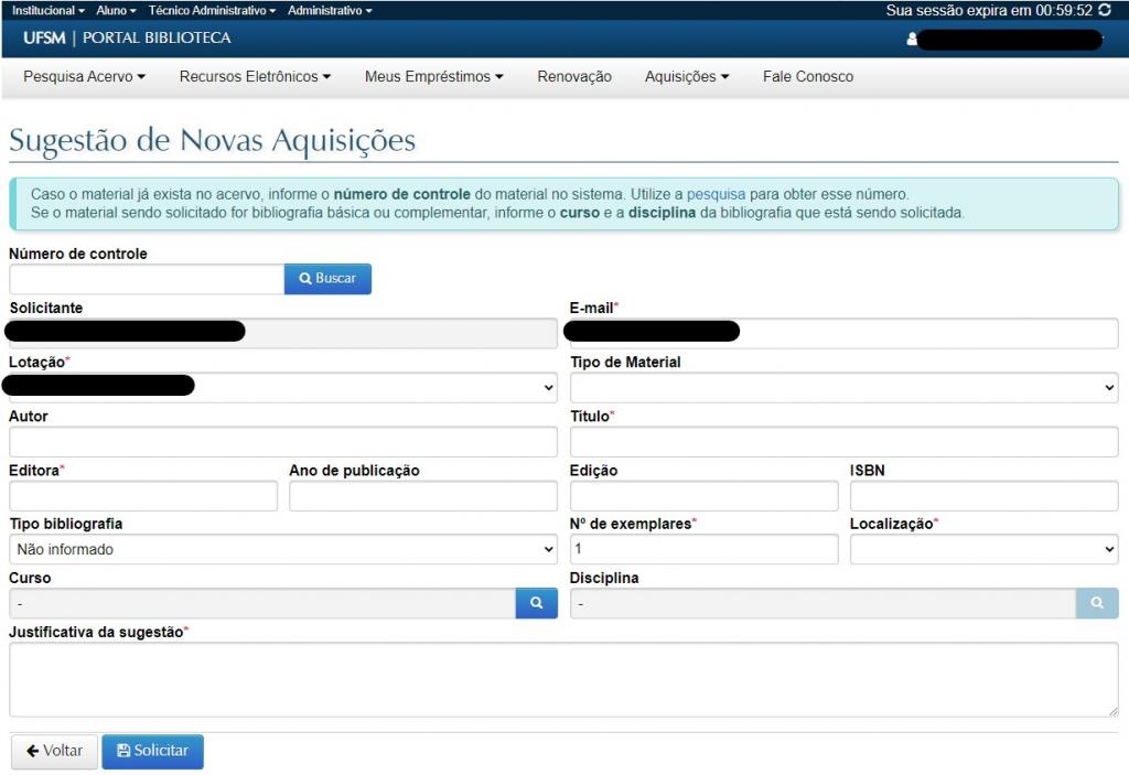 O acesso ao formulário continua o mesmo: aberto para todas as pessoas com vínculo com a UFSM (discentes, docentes e servidores técnico-administrativos em educação) e no Portal Biblioteca (menu superior “Aquisições” – “Nova solicitação”).