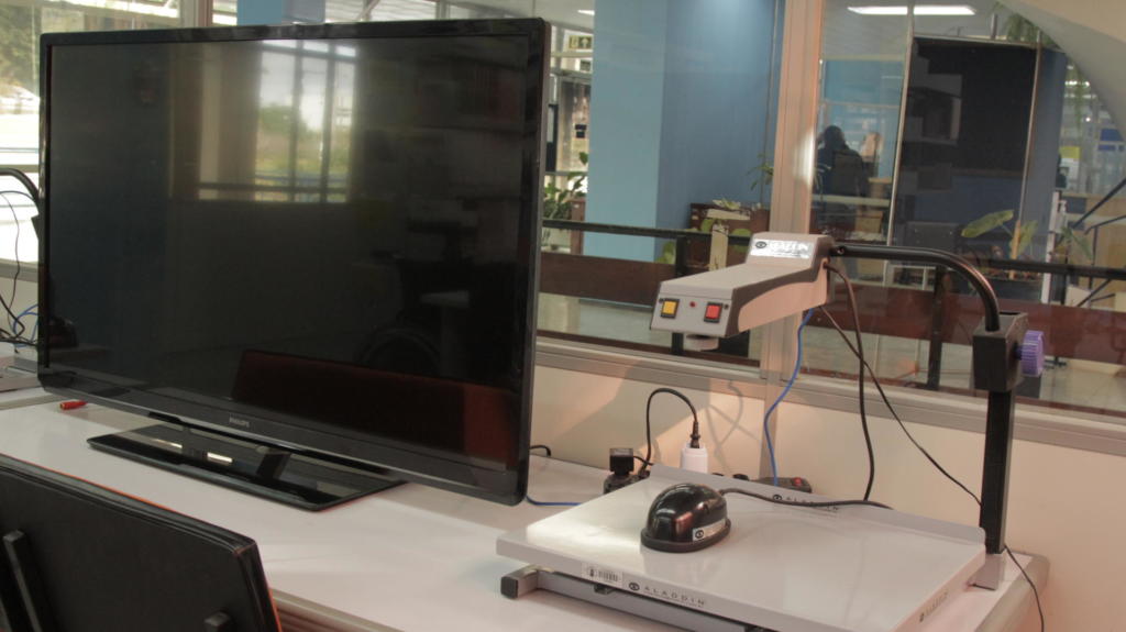 O espaço oferece duas lupas eletrônicas conectadas a monitores de 32 polegadas que permitem ampliar a imagem em 200%, favorecendo que pessoas com baixa visão possam realizar a leitura.