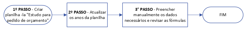 1º PASSO – Criar planilha .XLSX conforme modelo na pasta correspondente em Drive/1 Orçamento e prestação de contas e nomeá-la “Estudo para pedido de orçamento para AAAA”, onde AAAA é o ano;