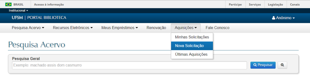 A comunidade acadêmica pode acessar através da pesquisa no catálogo, no menu superior a opção “Aquisições” e depois “Nova solicitação.” Se faz necessária a identificação e preenchimento de todos os dados solicitados, para favorecer agilidade na avaliação. Cada título a ser sugerido requer repetição do processo para que se crie análise individualizada e avisos relacionados ao titulo sugerido. As solicitações passam por análises relacionadas aos critérios da Política de Desenvolvimento de Coleções das Bibliotecas da UFSM para seguirem o processo e seus encaminhamento, mas dependem de recursos para serem efetivadas.