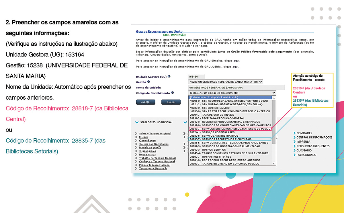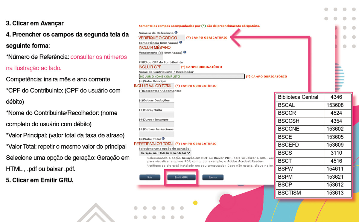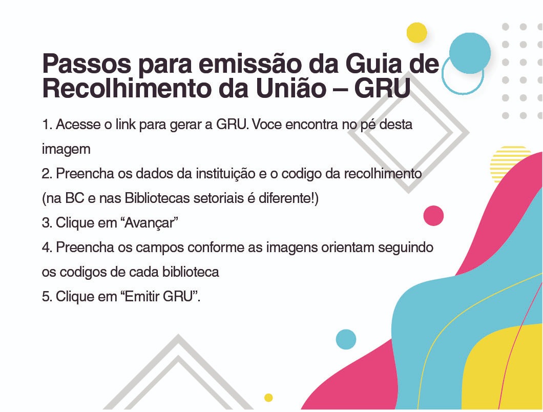 - Atenção ao gerar a GRU quanto as informações a serem inseridas, no caso de erros o comprovante de pagamento poderá não ser aceito. Caso tenha dúvidas solicite a GRU na biblioteca em que consta a pendência. Verifique os contatos.