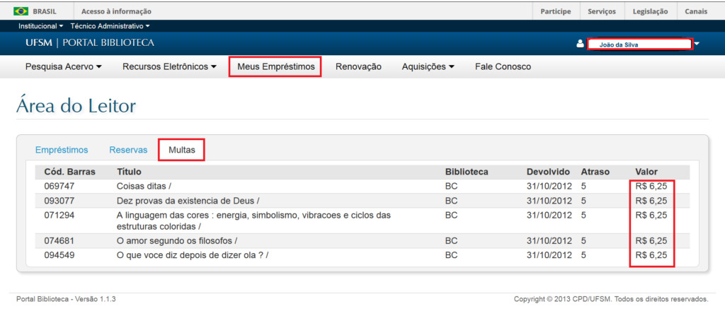 - A GRU pode ser emitida apenas após a devolução do material. Com os itens entregues, o valor gerado poderá ser acessado. Para saber o valor da taxa de atraso e a biblioteca correspondente, entrar com login e senha no Portal Biblioteca, no menu “Meus Empréstimos” na aba “Multas”.