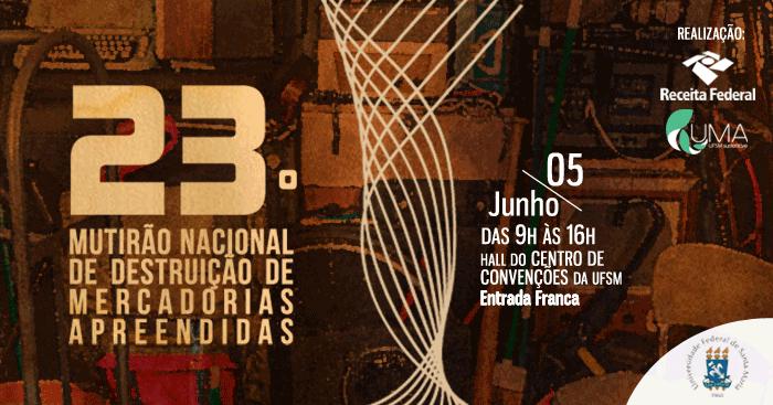 A Receita Federal, em parceria com a Universidade Federal de Santa Maria, realizará na próxima quarta-feira (5), o 23º Mutirão Nacional de Destruição de Mercadorias Apreendidas. As atividades ocorrerão entre 9h e 16h, no Hall do Centro de Convenções, no campus sede, em Camobi. No evento, haverá exposição de materiais apreendidos pela Receita e doados a associações de seleção de resíduos recicláveis, tais como brinquedos, cigarros, guarda-chuvas, tecidos, equipamentos eletrônicos. Além disso, também será demonstrado o processo desde a descaracterização até a transformação dos materiais em produto final, como a retirada de fibras de brinquedos de tecido para transformação em roupas de cama.