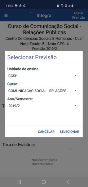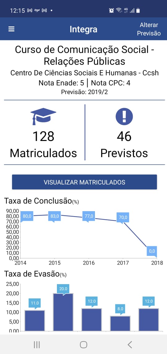 Além dessas informações o coordenador tem acesso a outros indicadores do seu curso. Geralmente, o período de informações sobre o indicador é de cinco anos, Os indicadores mostrados no aplicativo são a Taxa de Conclusão do Curso, a Taxa de Evasão, o número de matriculados e o número de formados.