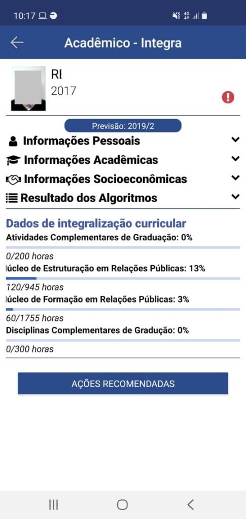 Na sequência são exibidas várias categorias de informações: informações pessoais, informações acadêmicas, informações socioeconômicas e resultado dos algoritmos. Além das categorias de informações é mostrado um resumo dos dados de integralização curricular.