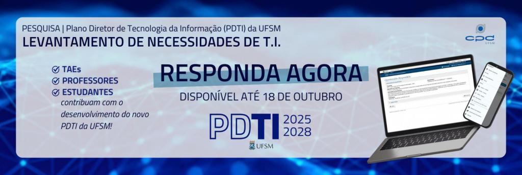 Para responder acesse o Portal de Questionários ou o aplicativo UFSM Digital até o dia 18/10/2024. Responder leva apenas alguns minutos, e suas respostas farão uma grande diferença no desenvolvimento do PDTI.