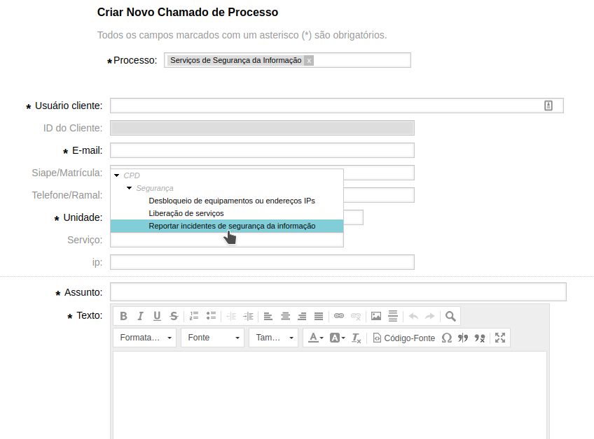 Para reportar um incidente de segurança, acesse nosso sistema de serviços em https://servicos.cpd.ufsm.br/ e crie um novo chamado com o Processo “Serviços de Segurança da Informação” e, após preencher os demais dados, selecione o serviço “Reportar incidente de Segurança da Informação” conforme a imagem abaixo.