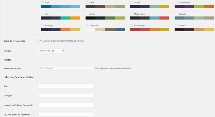 Entrando na opção “Seu perfil”, você pode fazer algumas alterações na visualização da sua plataforma, como alterar a paleta de cores e também adicionar algumas informações ao seu perfil, contas em redes sociais, etc; podendo deixar a plataforma da forma que você desejar.