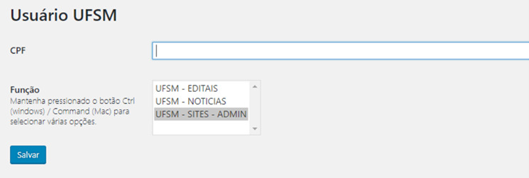 Abrirá uma página com uma caixa de texto na parte superior da tela. Nesta caixa você deve escrever o CPF do servidor ou aluno que você quer adicionar como usuário. Feito isso, selecione o botão “Salvar” e o novo usuário já pode acessá-lo.