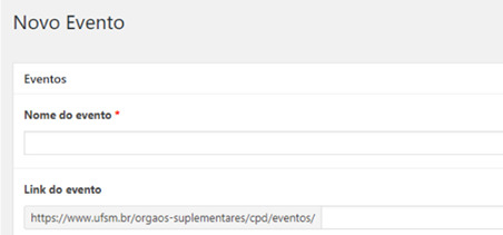 Todas as edições do evento que possuírem a mesma tag irão aparecer na página do evento na área “Todas edições”. Com este campo configurado, uma URL amigável de eventos é criada automaticamente enviando o usuário sempre para a última edição do evento. A URL do evento será sempre https://www.ufsm.br/eventos/tag_de_edições. A JAI, por exemplo, fica disponível pela UFSM na URL https://www.ufsm.br/eventos/jai. Outro exemplo de evento é o https://www.ufsm.br/eventos/wcba