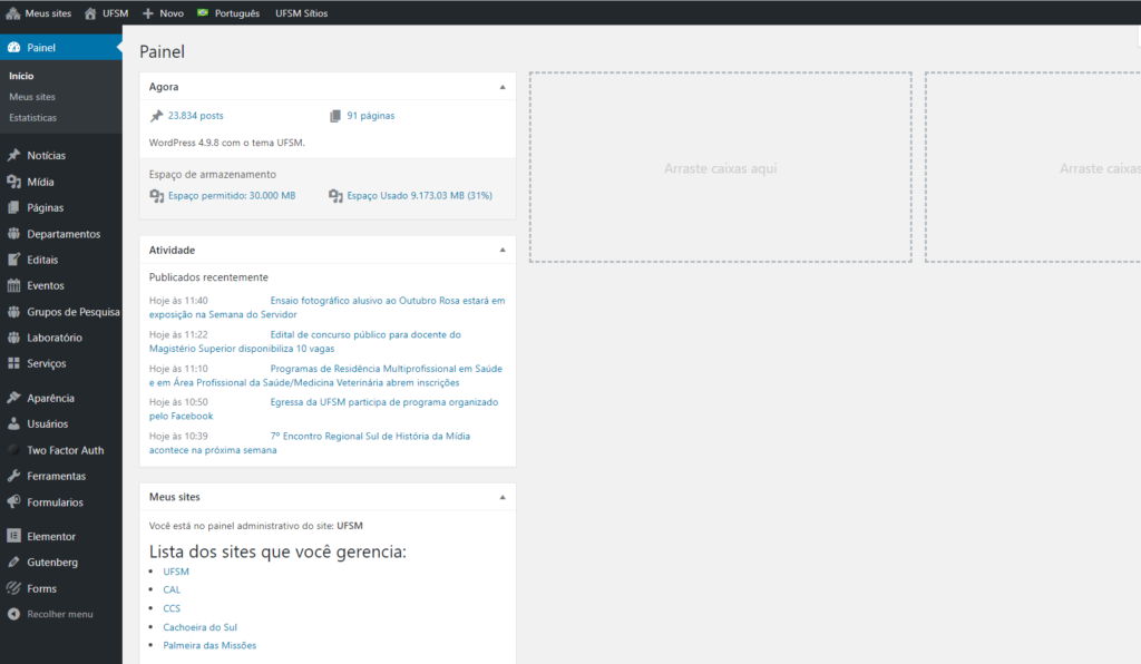 No painel do WordPress você tem acesso a várias funcionalidades e informações como, por exemplo, quantos posts e quantas páginas já foram geradas em todo o sítio da UFSM. No item “Atividades”, são mostradas as últimas publicações feitas no sítio.