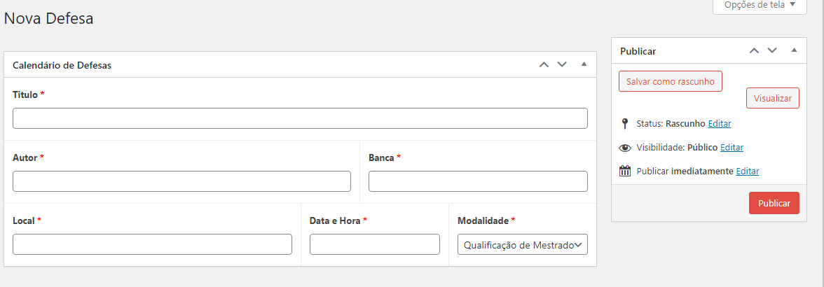 Atentando que todos os são informações obrigatórias para o cadastramento do evento no calendário de defesas.