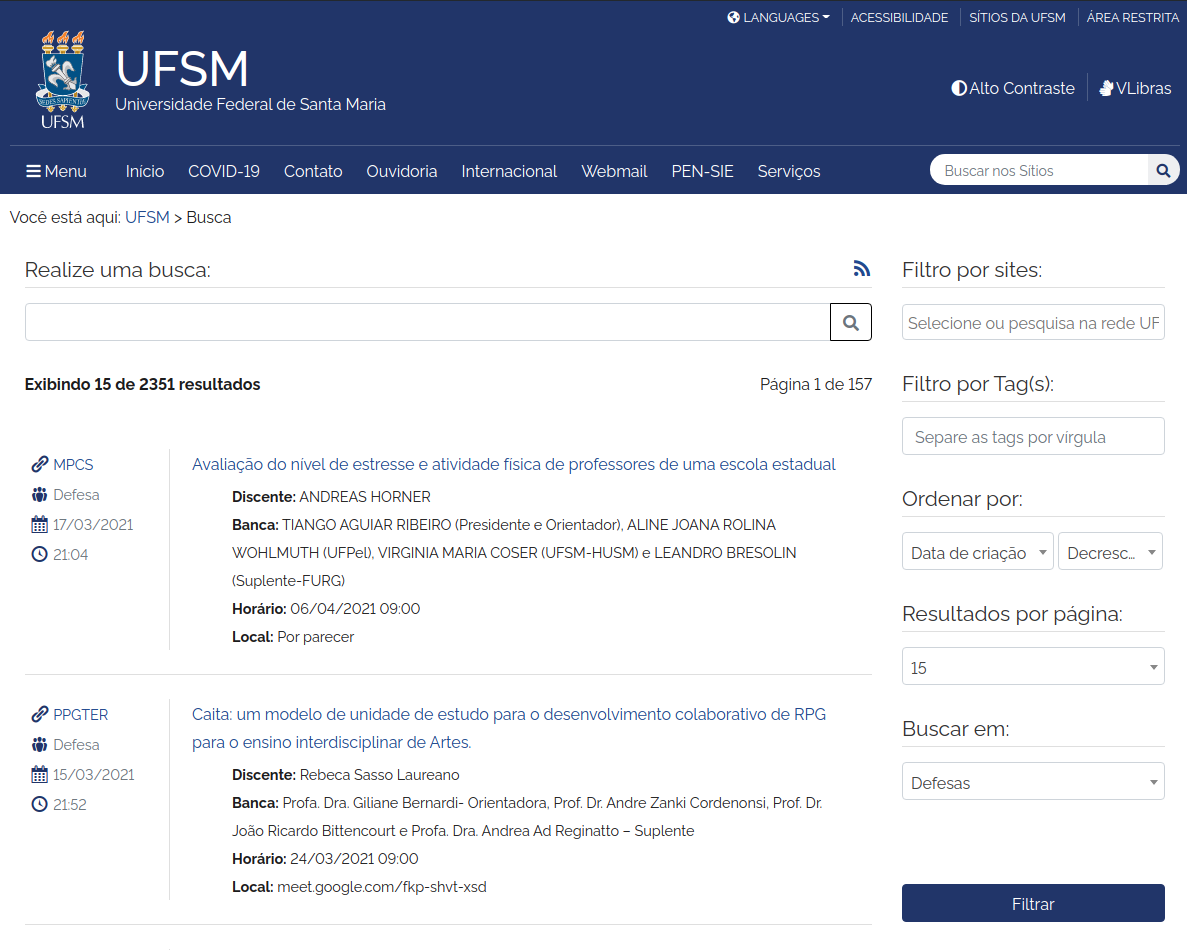 Para a unificação da informação, todos os eventos cadastrados no Calendário de Defesas estarão disponíveis para o público em uma única página: ufsm.br/calendario-de-defesas.