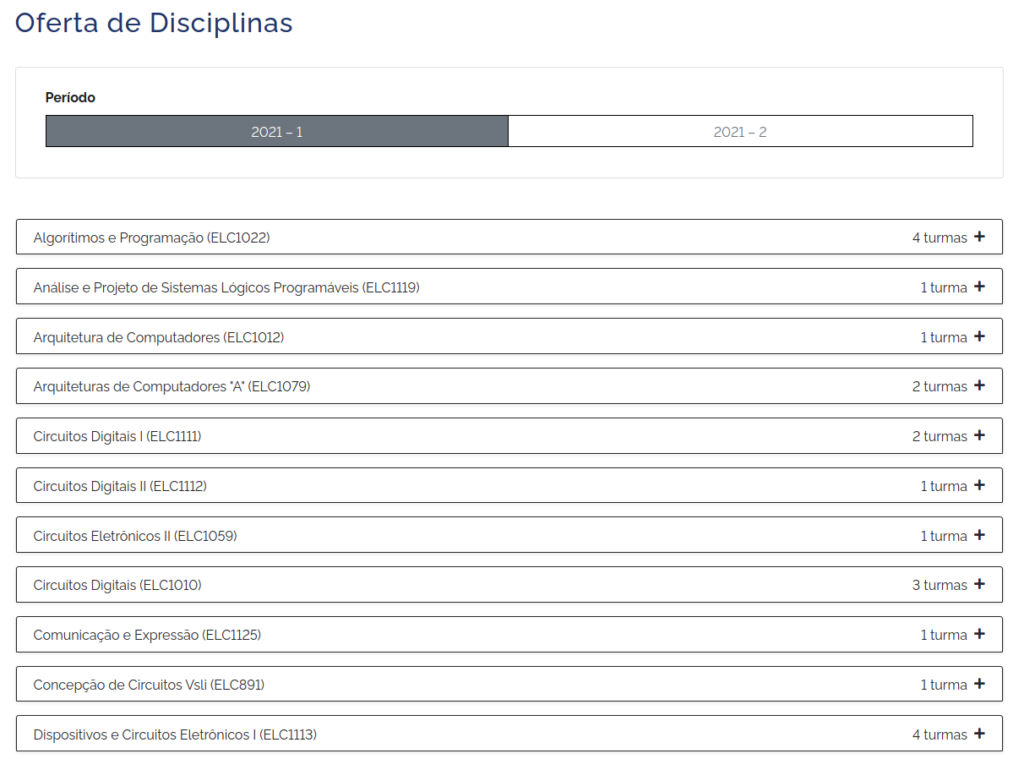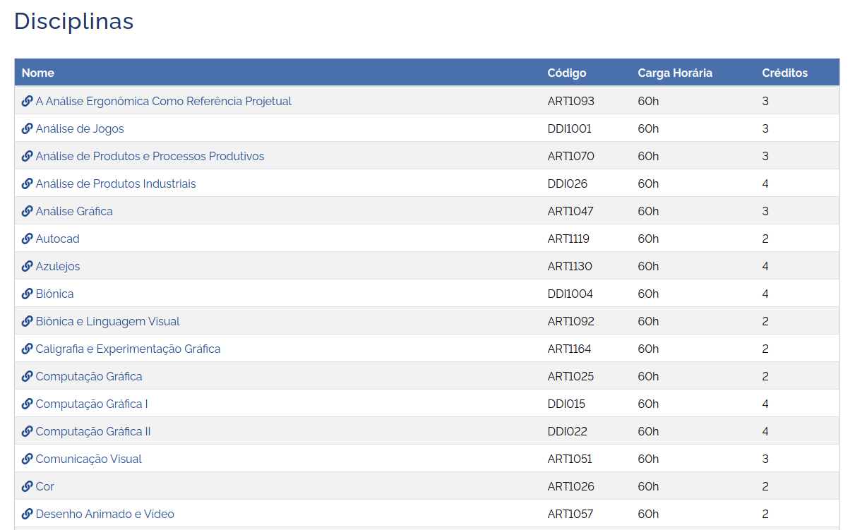 A página de disciplinas traz a lista com todas as disciplinas ativas do Departamento ordenadas por nome, são exibidos código, a carga horária e os créditos disponíveis. O nome possui um link para a página da disciplina no Ementário da UFSM.