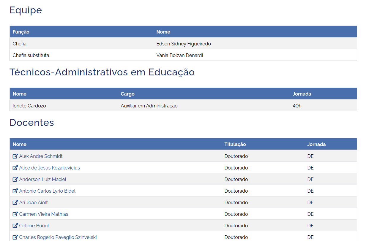 É utilizado um conjunto de informações cadastradas localmente e outras recuperadas diretamente do banco de dados do Sistema de Informações para o Ensino (SIE), mantido pelo Centro de Processamento de Dados (CPD), para apresentar as seguintes páginas para cada Departamento: