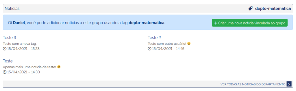 Gestores de sítios e co-editores de Departamentos tem a possibilidade de adicionar notícias vinculadas ao Departamento com base em uma tag única, sendo esta baseada no campo “Tag de Notícias” configurado no cadastrado do Departamento. As notícias vinculadas serão listadas na página inicial do Departamento, abaixo do cabeçalho e logo acima da seção de “Apresentação”.