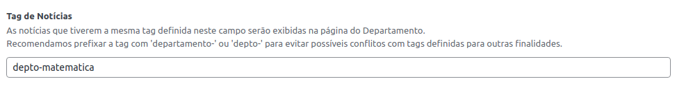Para configurar a Tag de Notícias basta acessar o painel de edição do Departamento e localizar o campo “Tag de Notícias”, observando a recomendação de utilizar um prefixo para que se crie uma tag única de modo a não puxar notícias já adicionadas em uma tag existente. Entretanto, caso sua unidade já utilize uma tag para as notícias de cada Departamento, não há problema em utilizar uma tag existente para este mesmo fim.