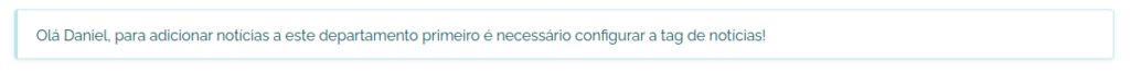Como o cadastro de notícias não foi uma funcionalidade planejada desde o início para os Departamentos, o cadastro de uma tag não é obrigatório. Desta forma, caso a tag não tenha sido configurada, uma mensagem será exibida orientando o usuário sobre a necessidade dessa configuração.